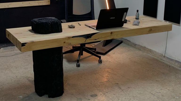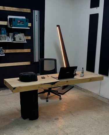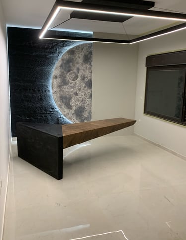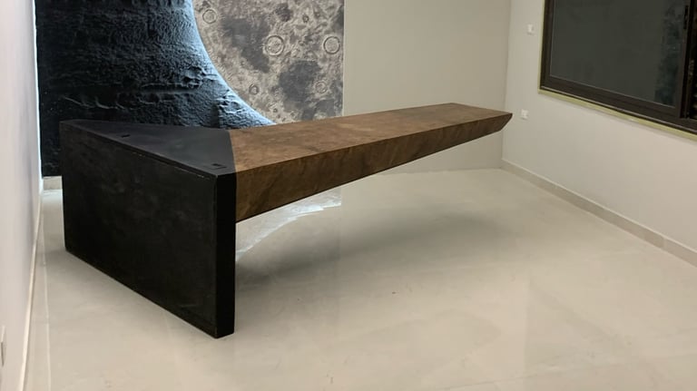 3 . تصميم وتنفيذ مكتب معلق بوزن 100 كيلو جرام وسطح خشبي طائر بطول مترين في الهواء